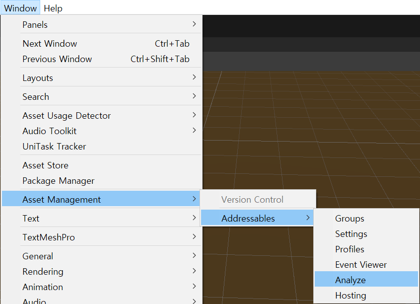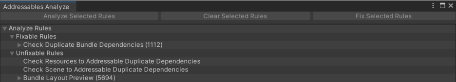 - 에디터 상단 메뉴 > Window > Asset Management > Addressables > Analzye