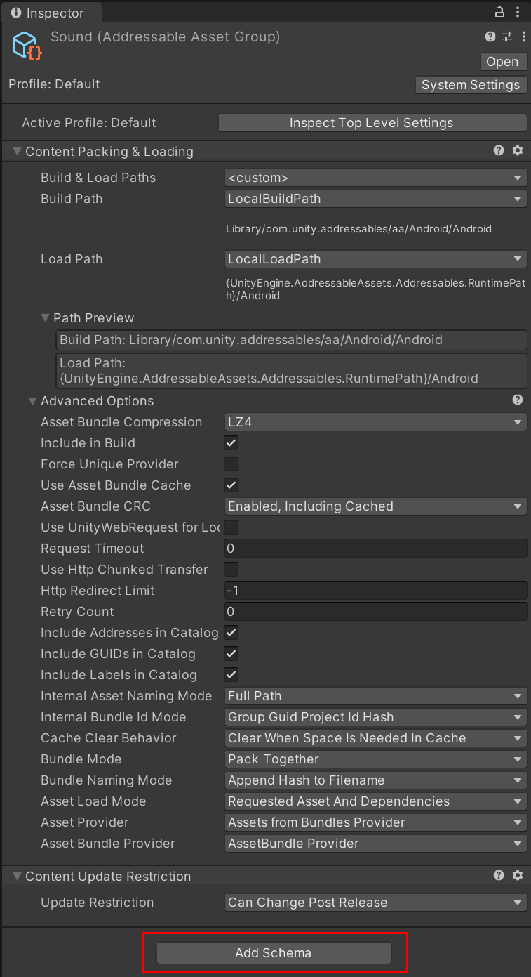 public class CustomSchema : AddressableAssetGroupSchema