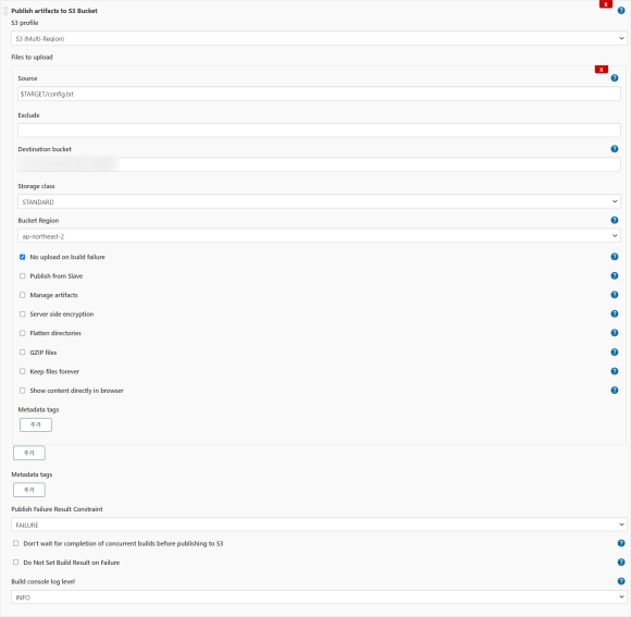 - Jenkins > Jenkins 관리 > 시스템 설정 > Amazon S3 profiles > '추가' 버튼 클릭