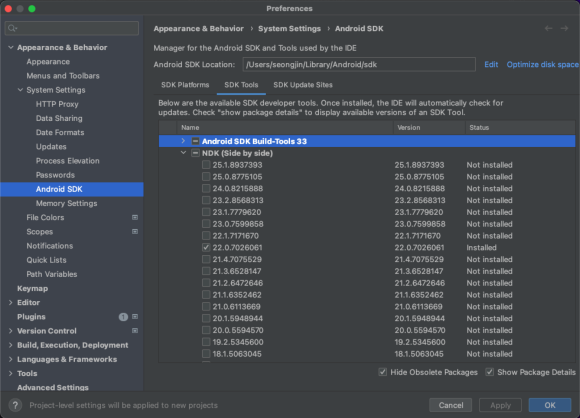 안드로이드 스튜디오를 통해 SDK가 설치된 경로를 확인하면 아래와 같다.