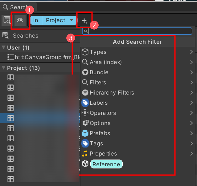 검색은 기존의 Hierarchy와 Project Window 툴바에서 제공되던 검색 필터와 유사한 방식으로 사용 가능하며, (ex) t:prefab t:scene 등) 좀 더 강화된 검색 표현식(LISP의 S-expression과 유사)을 추가적으로 제공하고 있다. 또한 검색 쿼리 작성 없이 다양한 GUI 검색 필터를 제공하고 있어 사용이 매우 용이했다.
